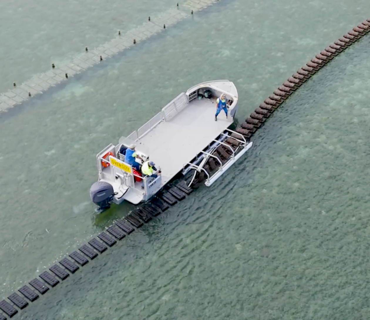 The ALS system is undoubtedly the most efficient farming method in intertidal waters and limits environmental impacts by getting farming gear off the sea floor with secure and simple attachment methods. Oyster baskets are suspended from cable running between posts that have been driven into the sea floor stretching over a length of 300 ft.